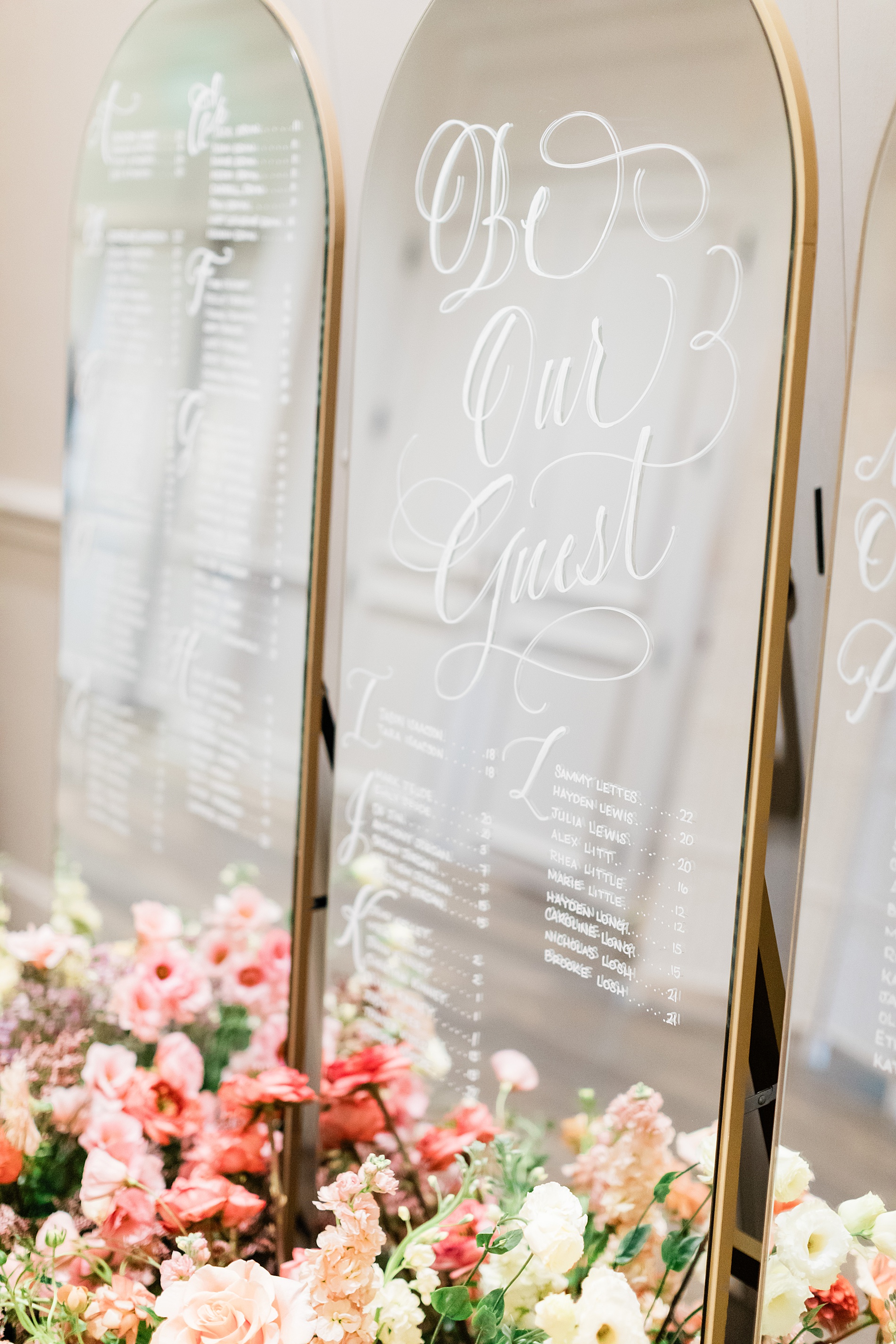 Their wedding reception featured a three-piece mirrored seating chart. The arched mirrors with gold frames were lettered by hand. A fresh flower display of white, cream, and various pink flowers sat at the base of the seating chart making it an eye-catching display.